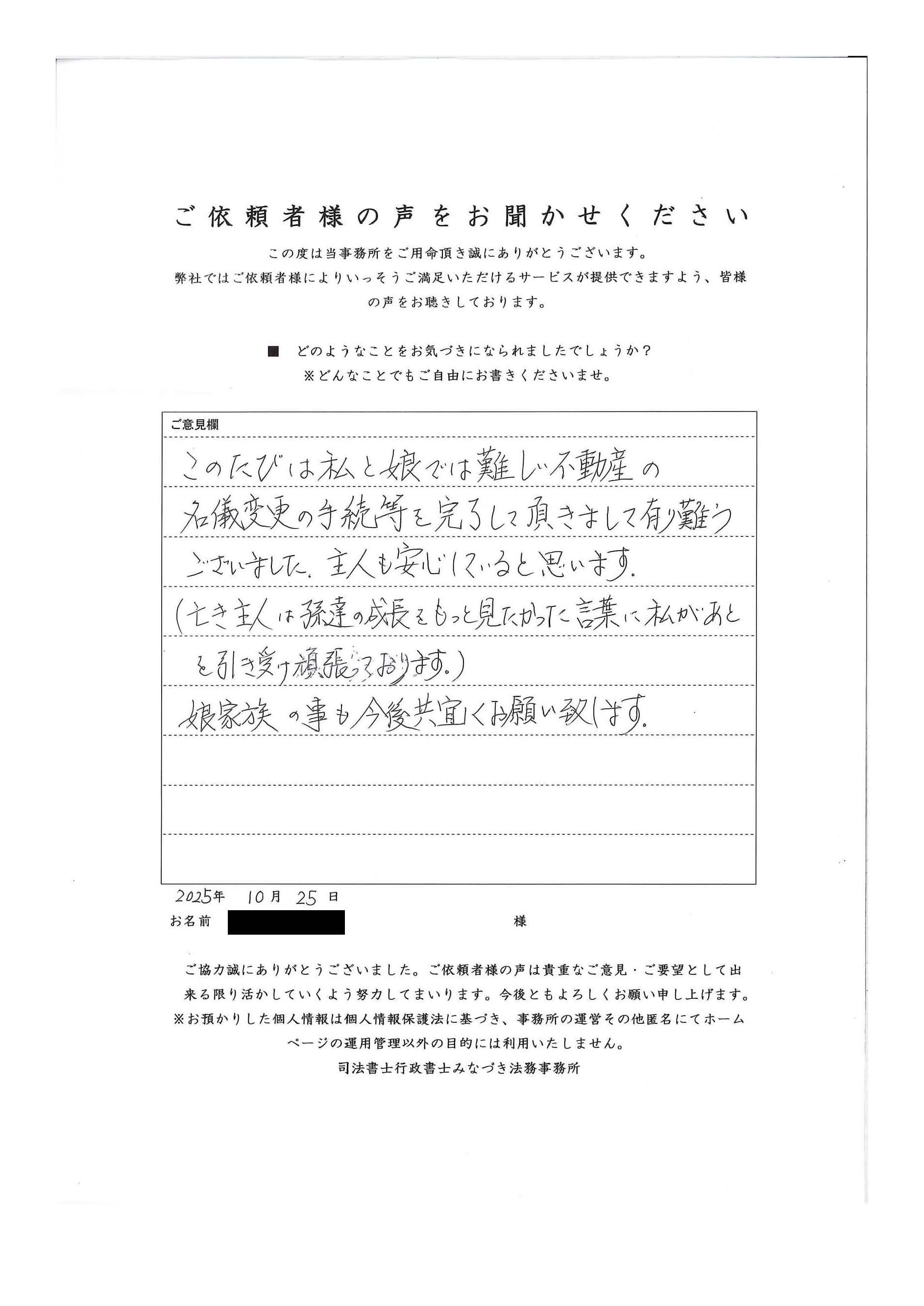 このたびは私と娘では難しい不動産の名義変更の手続き等を完了して頂きまして有難うございました。主人も安心していると思います (亡き主人は孫達の成長をもっと見たかった言葉に私があとを引き受け頑張っております。) 娘家族の事も今後共宜くお願い致します。