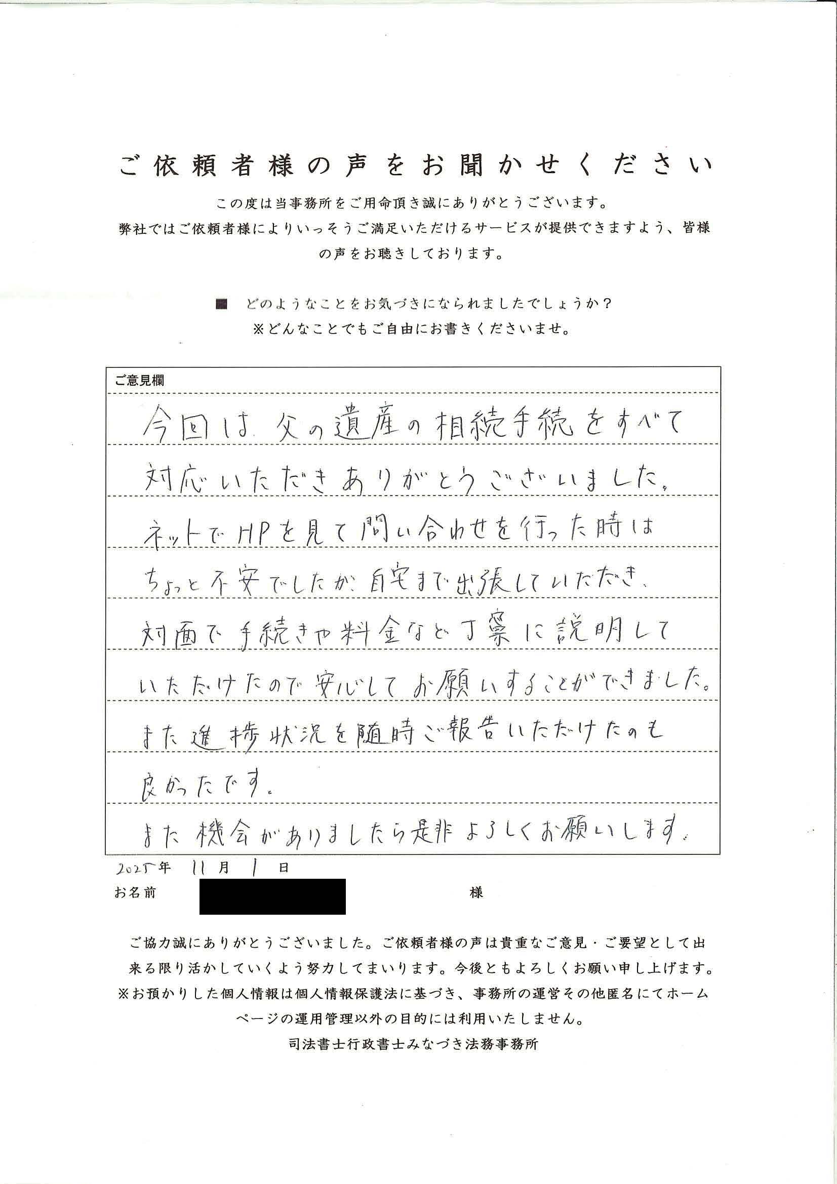 今回は父の遺産の相続手続をすべて 対応いただきありがとうございました。 ネットでHPを見て問い合わせを行った時はちょっと不安でしたが、自宅まで出張していただき、対面で手続きや料金など丁寧に説明していただけたので安心してお願いすることができました。 また進捗状況を随時ご報告いただけたのも良かったです。 また機会がありましたら是非よろしくお願いします。